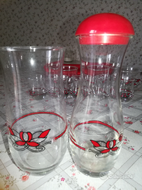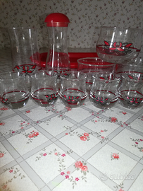 2 contenitori alti ti po vasetto , 3 coppette Macedonia ,5 bicchierini liquore in vetro alt cm 6.,tutti con decoro rosso.
