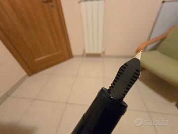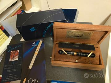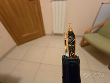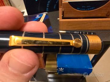 Serie limitata 4.000 esemplari, fusto in resina di colore blu petrolio decorata a cerchi concentrici a rievocare le onde, dettagli finiture in metallo dorato e argentato, pennino in oro 18kt misura F, caricamento a stantuffo, lungh. cm 14. Meccanismo perfettamente funzionante. Corredata di scatola in legno, controscatola e garanzia.