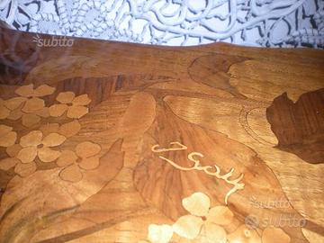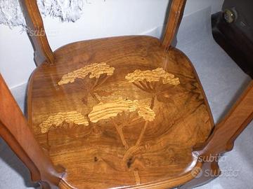 Sellette firmata "Guth" in legno di noce biondo finemente intagliato ed intarsiato a motivo floreale con legni diversi ed essenze preziose, di smaccato gusto Art Nouveau.