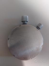 Omega cronometro gara rattrapante’ 1/10-second stopwatch, c. 1965 -- watch case: metal, partly blackened, screwed back, diameter c. 55 mm movement: manual winding, lever movement, numbered 2701107, calibre 19001A, 36,000 semi-oscillations per hour, 7 jewels dial: black, Arabic numerals, white seconds ring with 1/10-second division, auxiliary dial for 15-minute index, ‘rattrapante’ split-seconds