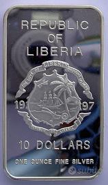 LIBERIA 10 $ 1997 ONCIA ARGENTO 999 PASSAGGIO HONG KONG DALL' INGHILTERRA ALLA CINA CONSERVAZIONE COME DA FOTO
