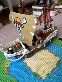 Fedele riproduzione con mattoncini colorati (1376 pezzi) della mitica nave pirata Going Merry di Rubber/Luffy e la sua ciurma direttamente da One piece.