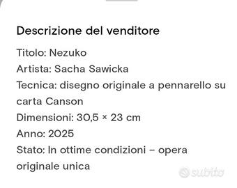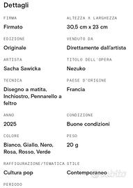 Opera ispirata ai manga di un giovane artista emergente francese ( tutte le info nelle foto ) . Pezzo unico e nuovo , disponibile tra qualche giorno, lo ho appena acquistato all ' asta. Stima da galleria : 150/200 € . Un piccolo investimento d' arte. Certificato di autenticità firmato dall' artista incluso.Preazzo leggermente trattabile.