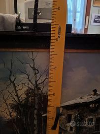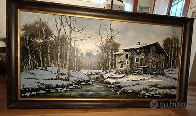 Il quadro rappresenta una scena alpina invernale con baita in pietra, bosco di betulle e corso d’acqua: soggetto molto ricercato per arredamento di chalet, hotel, ristoranti di montagna e case con stile rustico-elegante.