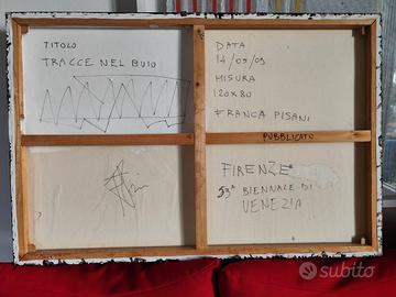 Opera su tela del 2009, titolo "TRACCE NEL BUIO", misura 120 x 80 cm. Opera corredata di autentica dell'artista su foto, fornisco libro in cui é stata pubblicata in occasione della partecipazione alla 53a Biennale di Venezia. Opera di particolare manifattura ed espressione dell'artista, non a caso scelta per una delle manifestazioni più importanti a livello mondiale. Non un'opera "ordinaria" della Pisani. Non spedisco. Rimango a disposizione per qualsiasi info, chiedete il prezzo in chat Subito. Prezzo affare!