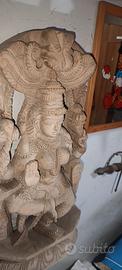 La scultura mostra dettagli intricati e un'iconografia tipica dell'arte indù, con la figura che assume una posa dinamica e decorata con gioielli e copricapo.