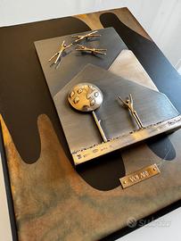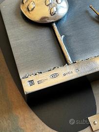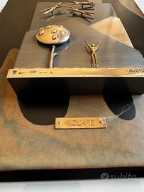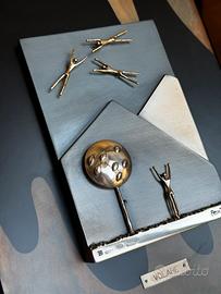 Opera originale dello Studio Ottaviani intitolata “Volare”, realizzata interamente in argento 925 e montata su pannello con sfondo in metallo e legno decorato. La scena, dal forte impatto poetico e simbolico, rappresenta figure stilizzate in volo sopra un paesaggio essenziale, con un personaggio che guarda verso l’alto in un gesto di gioia e liberazione.