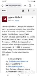 Trattasi di incisioni calcografiche a tiratura limitata (99/99), foglio intonso 50x35 Magnani di Pescia, facenti parte di una cartella edita da Edizioni del Sileno "Storie di Castelli, Principesse e A-Mori".