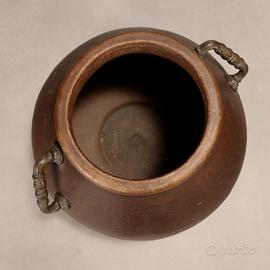 Orcio in terracotta dipinta color marrone con due maniglie in metallo patinato