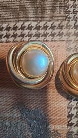 orecchini vintage anni 80 a clip in metallo bagnati in oro con perle e brillantini. molto eleganti. diametro cm 3
