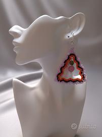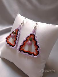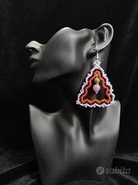 Questi spettacolari orecchini statement celebrano l'arte del bead weaving attraverso un design triangolare dal carattere audace e ricercato. Ogni pezzo è meticolosamente intessuto a mano utilizzando pregiate rocailles di vetro multicolore che creano un mosaico cromatico vibrante e ipnotico. Al centro della struttura, l'eleganza naturale delle gemme di giada e agata aggiunge un tocco prezioso e materico, fondendo perfettamente l'estetica bohémien con un rigore artigianale d'eccellenza. La loro silhouette leggera ma importante li rende l'accessorio ideale per chi desidera un gioiello unico, capace di illuminare il volto con riflessi cangianti e un fascino senza tempo tipico dello stile boho chic.