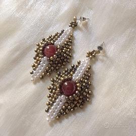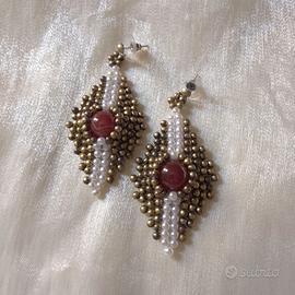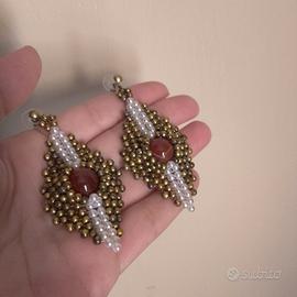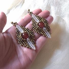 Orecchini con pietre dure di corniola rossa Intessuti a mano con rocailles di ottone stile vintage. Orecchini esclusivi realizzati a mano in Italia con la tecnica bead weaving. Questo gioiello unico intreccia pietre dure di corniola naturale con luminose perline bianche e autentici beads in ottone vintage anni '70, smaltati e rigenerati per un design moderno e raffinato. La forma allungata li rende perfetti per ogni occasione, garantendo massima eleganza e resistenza. Creati senza nichel o colle tossiche, utilizzano solo materiali certificati di alta qualità. Un’edizione unica che unisce l’eccellenza artigianale a un prezzo accessibile.