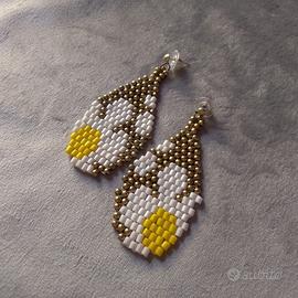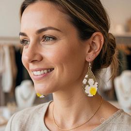 Orecchini artigianali statement a goccia motivo floreale boho chic Ottone. Questi orecchini statement in stile boho chic incantano con il loro ricercato motivo a goccia dalla fantasia floreale astratta. Realizzati interamente a mano, fondono la lucentezza delle rocailles in ottone alla precisione delle perline Miyuki in vetro, creando un mosaico materico unico e vibrante. La struttura è completata da una pratica chiusura con gancio a perno in acciaio ottonato, scelto appositamente per le sue proprietà anallergiche e la resistenza nel tempo. Un accessorio artigianale perfetto per chi desidera unire l'eleganza contemporanea a un tocco etnico e sofisticato.