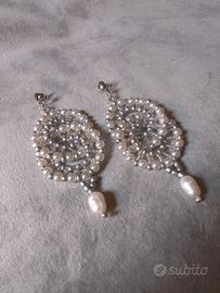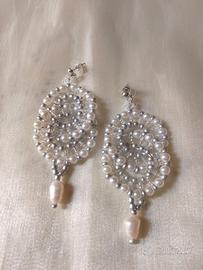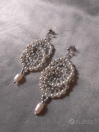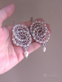 Bellissimi orecchini artigianali a doppio cerchio, realizzati con perline cerate bianche e beads di vetro color argento con perle d'acqua dolce pendenti. Sono perfetti per un'occasione speciale o per aggiungere un tocco di eleganza a qualsiasi outfit.
