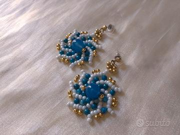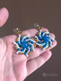Orecchini a vortice l, eleganti, adatti per tutte le occasioni. Intessuti con perline e beads di colore blu e celeste con accenti di colore dorato. Pietre dure naturali di agata blu.