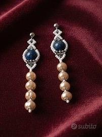 Orecchini eleganti, pendenti lunghi di alta fattura artigianale, caratterizzati da una complessa lavorazione a perline che incastona una gemma centrale e una cascata di perle. La chiusura è un dettaglio fondamentale, essendo dotata di un perno a farfalla in acciaio chirurgico, un materiale scelto per le sue proprietà anallergiche, garantendo così comfort e sicurezza per chi ha la pelle sensibile.