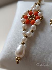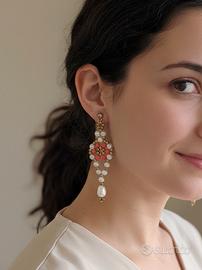 Questi incantevoli orecchini tessuti a mano fondono il fascino vintage neo-barocco con l'eleganza contemporanea. Sono meticolosamente lavorati con luminose perle di Maiorca bianche e scintillanti cristalli rosso caldo, incorniciati da rocailles in ottone. I ganci a perno in ottone anallergico assicurano un comfort impeccabile, mentre preziose perle di fiume naturali pendenti aggiungono un tocco di raffinata grazia. Un accessorio unico per chi ama distinguersi con classe.