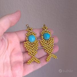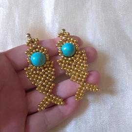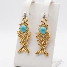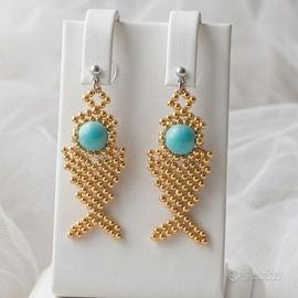 Orecchini Fishbone Lisca di pesce artigianali Boho Chic con pietre di turchese. Questi orecchini in stile boho chic a forma di lisca di pesce sono unici e originali. Realizzati interamente a mano con rocailles dorate e gemme di turchese naturale, rappresentano un accessorio prezioso e di grande impatto visivo. Perfetti per chi ama lo stile etnico e naturale, si adattano a ogni tipo di outfit, dal quotidiano alle occasioni più ricercate. La loro particolare silhouette a lisca di pesce li rende speciali, unendo artigianato e design in un gioiello simbolico e luminoso.