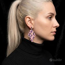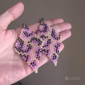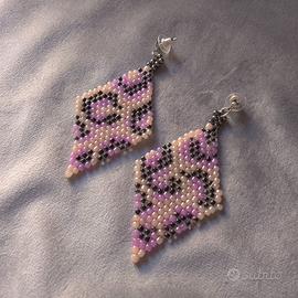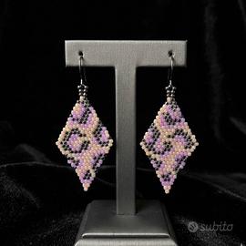 Orecchini Etnici boho Chic Geometrici Leopardati. Questi orecchini geometrici a forma di rombo rappresentano un raffinato esempio di micro-tessitura manuale. La trama riproduce un sofisticato motivo leopardato nelle tonalità del viola, pesca e nero, creando un accessorio dal carattere deciso e contemporaneo. Ogni singola perla è intrecciata con precisione per garantire una struttura leggera e flessibile, ideale per essere indossata tutto il giorno. Il design è completato da un pratico gancio a perno in acciaio antiallergico, che assicura comfort e sicurezza anche per le pelli più sensibili.