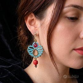 Questi raffinati orecchini artigianali fondono il fascino dell'antico Egitto con la precisione della tecnica bead weaving. Realizzati a mano con perline Miyuki Delica turchesi e rocailles in ottone, presentano un design geometrico impreziosito da un cristallo rosso sfaccettato e un’autentica pietra di corallo bambù. Il contrasto cromatico tra il turchese e il rosso corallo dona un carattere etnico deciso e ricercato. La monachella a perno in ottone antiallergico garantisce massimo comfort e sicurezza. Un pezzo unico ideale per chi ama i gioielli con una storia da raccontare.