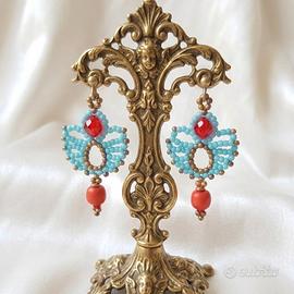 Orecchini Artigianali Etnici Stile Antico Egitto Cleopatra Corallo Rosso Pendente.