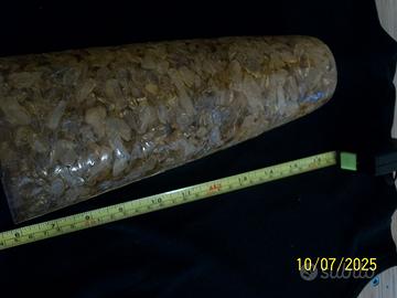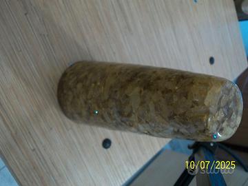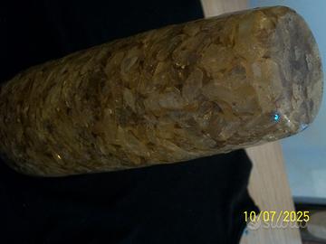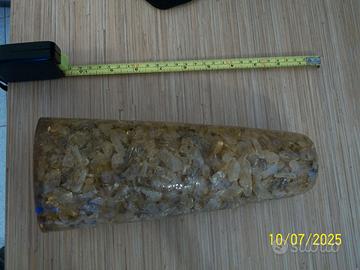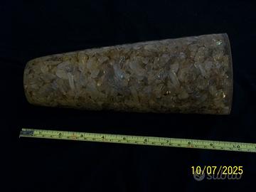 Grande blocco di agglomerato di quarzo ialino + citrino ialino a scaglie. Questo monoblocco NUOVO di resina al poliestere (organica) contiene una lunga punta di quarzo ialino rivolta verso l'alto affogata nell' asse centrale, ed e' circondata da un rivestimento di scaglie di quarzo citrino. Questa composizione e' chiamata "orgonite non orgonite" inquanto non contiene metalli.Perche' la fodera di citrino? Perche' esso e' un tipo di quarzo che filtra e addolcisce l'energia grezza e a volte tagliente, fredda, del quarzo ialino, rendendola estremamente accettabile (ma non ridotta) anche da chi non e' abituato. Armonizza gli ambienti, li vivifica, rinforza piante e "umani" nei paraggi (entrambi hanno il sistema linfatico sul quale agisce fluidificandolo ottimamente) puo' essere usato anche per vivificare/vitalizzare l'acqua da bere in quanto la base superiore e' liscia e vi si puo' appoggiare bicchiere o bottiglia. A forma tronco conica, le sue misure sono: altezza cm 24,5 diametro maggiore cm 10 diametro minore cm 6, peso kg 2,5. La sua composizione priva di metalli ne permette l'assoluta innocuita' in caso di inquinamento elettromagnetico complesso (wifi. 4/5g) e puo' essere accostato con tranquillita' pure ai neonati o piccoli animali domestici. Voglio ricordare che da vari test risulta che gli agglomerati forniscono risultati simili ad un singolo quarzo avente stessa massa, ma con evidente risparmio di denaro. La massima resa si ottiene ponendo la base dentro al terreno umido. Vendita con formula AS IS. Chiedete pure se avete domande.