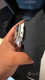 Vendo Orient RA-EL0001B00B , un orologio da immersione di alta qualità .completo di scatola e documenti . Questo diver unisce eleganza e robustezza, con una cassa in acciaio inossidabile da 43,4 mm e una ghiera unidirezionale nera con dettagli precisi. Il movimento automatico Orient 40N5A che monta anche il ProSaturation Diver il fratello piu grande . Il quadrante nero con indici luminescenti garantisce ottima visibilità. Impermeabile fino a 200 metri, è completato da un bracciale in acciaio robusto e confortevole. Perfetto per chi cerca un orologio versatile, adatto sia al mare che alle occasioni formali!