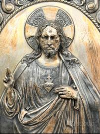 La figura di Gesù appare in alto rilievo, con aureola radiante e il simbolo del Sacro Cuore sul petto, rappresentato con fiamme, corona di spine e croce, in chiara allusione al suo amore redentore. La sua mano destra si eleva in gesto di benedizione, mentre la sinistra indica il cuore, rafforzando il messaggio spirituale.