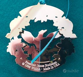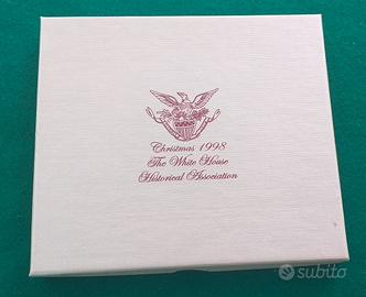 L'ornamento natalizio ufficiale della Casa Bianca del 1998 commemora James Buchanan con una raffigurazione dell'aquila e delle insegne dello scudo apparse per la prima volta sulla vetreria che il presidente Andrew Jackson acquistò per la Casa Bianca nel 1829. Il presidente Buchanan fu l'ultimo presidente a utilizzare il modello Jackson. Una corona di fiori di magnolia bianca e camelie rosse circondano l'aquila di porcellana bianca. Usata in condizioni ottime, con scatola originale cm. 13 x 15, libretto di accompagnamento originale. La decorazione è marcata.