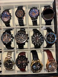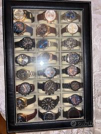 Vendo collezione di 24 orologi tra cui 23 orologi al quarzo e cronografi e 1 smart whatch tutti nuovi e regalo cassetta porta orologi.