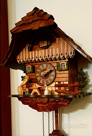 Orologio a cucù artigianale in legno, realizzato in Germania e perfettamente funzionante. Modello in stile chalet della Foresta Nera, completo di: