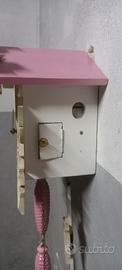 orologio particolare con pesi e tetto rosa e con ricami floreali sul frontale. funzionante.