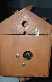 orologio a cucù perfettamente funzionante con l'uscita dell'uccellino all'ora e alla mezz'ora. completo di pesi pendolino e cimasa. misure altezza 21 larghezza 15 profondità 12
