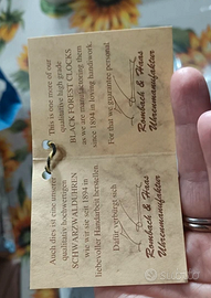 Splendido orologio a cucù originale della Foresta Nera (Black Forest) prodotto dalla storica manifattura Romba 1894 – Made in Germany. Orologio realizzato in legno intagliato a mano con raffinata decorazione a foglie di quercia e uccelli scolpiti, tipica tradizione artigianale tedesca. Presenta ancora cartellino originale Romba e marchio di qualità VdS (Association of Black Forest Clock) che certifica l'autenticità e la produzione nella Foresta Nera. Caratteristiche Produzione: Germania – Black Forest Marca: Romba 1894 Movimento meccanico a pesi Suono del cucù ogni ora Pendolo e pigne originali Struttura in legno intagliato Certificazione VdS Black Forest Clock Condizioni Ottime condizioni estetiche e meccaniche. Orologio completo e ben conservato, ideale sia per uso domestico sia per collezionisti. Prezzo €290 Spedizione Spedizione accurata con imballo professionale oppure ritiro a mano.