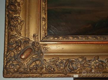 L’autentica cornice in legno misura cm. 90 x 77 è riccamente decorata ed in ottime condizioni pur risentendo di un piccolo ammanco di 1 centimetro nel cordoncino inferiore.
