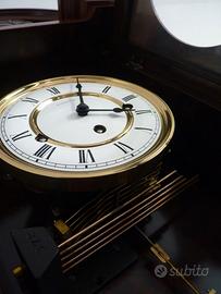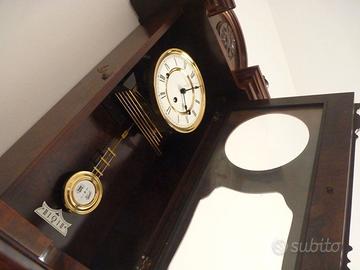Orologio a pendolo d'epoca a muro Kienzle (Germania), meccanismo con rintocco delle ore e mezze ore (suoneria Westminster), in legno pregiato con vetrinature, carica con chiavetta. Necessita di una revisione da parte di un orologiaio per la messa in funzione in quanto non è stato quasi mai usato. Consegna a mano.