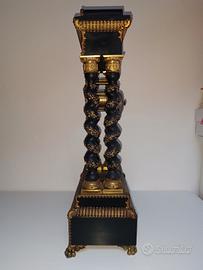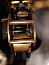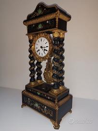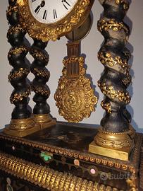 Orologio a pendolo impero con intarsi e decorazioni dorate su sfondo nero, colonne tortili che incorniciano il quadrante, pendolo in ottone riccamente decorato.
