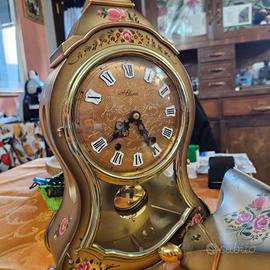 orologio a pendolo Eluxa vintage anni 60 perfettamente funzionante..appena revisionato...ha la sua mensola per appendere o sopra un mobile..movimento meccanico originale svizzero 8 giorni..suona ora e mezz ora...cassa in stile Neucharel con decorazioni floreali dipinte a mano..quadrante con numeri romani in ottone e porcellana...altezza 45 cm...