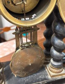 Elegante orologio a pendolo "a portico" in stile Napoleone III (Francia, 1850-1870 circa). La struttura è caratterizzata da quattro colonne a tortiglione in legno ebanizzato, arricchite da raffinati intarsi floreali dorati e inserti in madreperla/smalto. Quadrante: Smalto bianco con numeri romani e lancette traforate. Meccanismo: Movimento meccanico con scappamento a pendolo e suoneria ore/mezze su campana. Pendolo: Modello "a griglia" con lente decorata in bronzo/ ottone. Dettagli: Presente il coperchio posteriore traforato originale a protezione della campana. L'oggetto è integro e in buone condizioni estetiche originali con una splendida patina d'epoca. Piccoli segni del tempo compatibili con l'età. Meccanismo completo; si consiglia una revisione per garantirne la precisione funzionale dopo il trasporto.