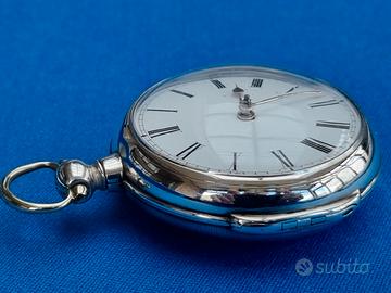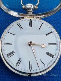 Antico e originale orologio da tasca, con doppia cassa in argento sterling, prodotto nel 1835 da Jackman a Fareham, cittadina nella contea dell'Hampshire, in Inghilterra, serie numero 17644. Funzionamento meccanico a carica manuale con scappamento a verga, splendido movimento inciso "Jackman Fareham 17644", in ottime condizioni. Stupendo quadrante originale in ceramica smaltata con indici delle ore in numeri romani; lancette originali. Entrambe le casse sono in ottime condizioni, le cerniere sono belle e robuste, tutte le copertine si chiudono in stretta aderenza. Vetro cristallo bombato originale. L’orologio è corredato di un documento originale di riparazione di un orologiaio inglese. La cassa esterna ha un diametro di 57 mm; l’orologio ha uno spessore di 27 mm ed un peso di circa 145 grammi.