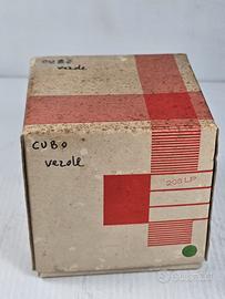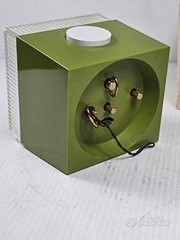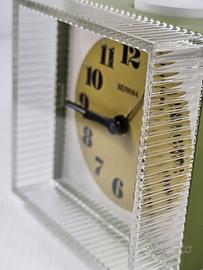 orologio da tavolo vintage con funzione sveglia, NOS con scatola oriqinale prodotto da Bernina negli anni '70 "Space Age" con una struttura a forma cubica in plastica verde e una cornice in plexiglas trasparente meccanico a carica manuale, oggetto da collezione che riflette l'estetica del design industriale di metà secolo