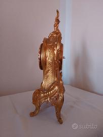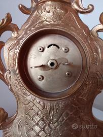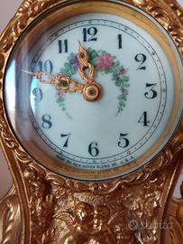 Splendido orologio da tavolo/camino originale della New Haven Clock Co. (Connecticut, USA), risalente al periodo 1895-1905. Un pezzo di antiquariato industriale americano in perfetto stile Rococò, molto decorativo.CARATTERISTICHE TECNICHE:Marca: New Haven (marchio inciso sul quadrante e sul meccanismo).Meccanismo: Meccanico a carica manuale, perfettamente funzionante. Carica: Molto pratica, tramite chiavi a "farfalla" integrate sul retro (impossibili da perdere). Dimensioni: Altezza 28 cm, peso circa 1,6 kg. Quadrante: In smalto bianco con ghirlande di fiori dipinte a mano, integro e senza crepe. .Condizioni: L'orologio è in ottime condizioni estetiche. Per massima trasparenza, segnalo un piccolo segno di usura sulla doratura di un piedino (mostra il metallo bianco sottostante), che attesta l'originalità della patina di oltre 120 anni e non ne pregiudica. NOTE SULLA VENDITA:SOLO RITIRO A MANO .Data la natura antica e la fragilità del materiale (antimonio), preferisco la consegna di persona per permettere all'acquirente di visionare l'oggetto e sentirlo in funzione. Per qualsiasi informazione contattatemi.