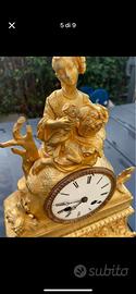 Vendo raffinato orologio da mensola francese della seconda metà del XIX secolo, realizzato in bronzo dorato finemente lavorato con decori floreali e figura femminile in abiti d’epoca.