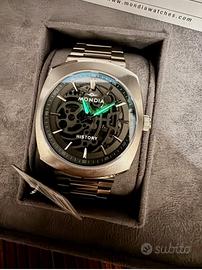Bellissimo e nuovissimo, da collezione intonso orologio full acciaio automatico da uomo Mondia modello History Skeleton MH-003-SS-BK-CM cassa 42 mm impermeabile a 5 Atm, cinturino con chiusura a farfalla, box originale, prezzo da cartellino concessionario svizzero €540, cedo per snellimento collezione, al miglior offerente, prezzo un poco trattabile.