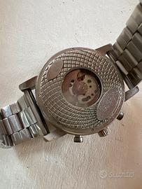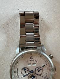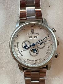 Vendesi elegante orologio meccanico a carica automatica marchio Xin Zhong Xin. Il design si ispira alla grande tradizione orologiera tedesca, con un quadrante ricco di dettagli e complicazioni funzionali. Caratteristiche principali: Movimento: Meccanico automatico (si ricarica con il movimento del polso). Quadrante: Color argento con lavorazione guilloché e lancette brunite. Complicazioni: Indicazione del giorno della settimana e del mese. Datario completo. Indicatore delle fasi lunari a ore 6. Materiale: Cassa in acciaio con bracciale a maglie regolabile. Stato: Usato ma perfettamente funzionante. Presenta lievi e normali segni di usura sulla cassa e sul cinturino che non ne compromettono l'estetica generale (come da foto).