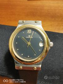 Orologio Berios vintage raro da trovare .Quadrante nero e ghiera cromata dorata ,cassa in acciaio inossidabile ,datario .Orologio usato con cura ,monta un cinturino in caucciù nero opaco con chiusura a scatto. Diametro 33 mm ,vetro in plexiglass Funzionamento al quarzo perfetto inser ita nuova batteria non presenta segni particolari di graffiature.