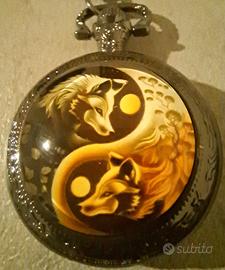 Orologio Tascabile Taiji Yin Yang ,Nero con Copertura Retro Flip, Numeri Romani Classici, con lupi, lupo