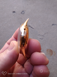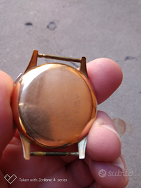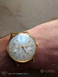 DELBANA Swisse made, orologio da polso, cronografo a carica manuale, 17 rubini, cassa in oro giallo 18K di circa 6-7 grammi, misura da uomo di 37 mm, doppio fondello, tasti quadri, il pulsante superiore avvia il cronografo e quello inferiore lo ferma e azzera, splendido quadrante con 2 quadranti secondari, numeri dorati applicati e scala tachimetrica, risalente agli anni '50. Perfettamente funzionante. 1200 euro.