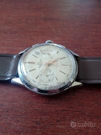 Propongo in vendita un cronografo anni "50 bicompax a carica manuale animato da un movimento Landeron. Orologio di dimensioni generose, 38,5 mm. corone escluse, dial originale con affascinante patina del tempo. Cassa in buone condizioni e fondello in acciaio chiuso a pressione. La cronografia funziona perfettamente e l'orologio può essere indossato tutti i giorni, con le dovute cautele. Il cinturino è nuovo, mai indossato e lo vendo ad euro 290,00.