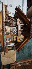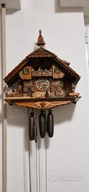 Casetta realizzata in legno, anche il quadrante, le lancette e l'uccellino sono in legno.Il tetto èrealizzato con singole tegoline di legno. I due fidanzatini si avvicinano e si baciano. Il cucù canta alle ore e alle mezz'ore, seguito dal suono del carillon alla cui musica si muovono i ballerini in legno e la ruota del mulino. L'orologio è dotato di un pratico dispositivo spegni suoneria manuale e automatico. carica ogni 8 giorni. no difetti disponibilità di altre foto e video.p